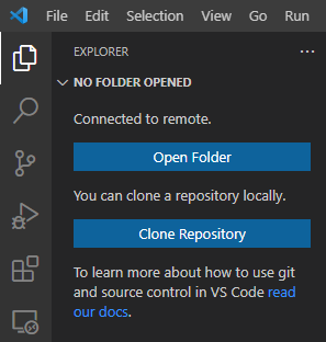 연결하고 나서 좌측 Explorer 탭을 클릭하면 Connected to remote 에서 "Open Folder" 를 클릭한다.