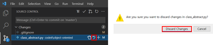 최종적으로 Discard Changes를 누르면 이전 소스로 원복해 버리고, source control 목록에서 제거되어 버린다.