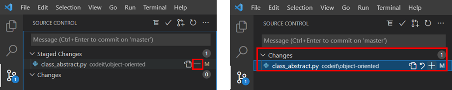 ' - ' 버튼을 누르면 스테이징 취소가 되어 우측 상태로 원상 복구가 된다.