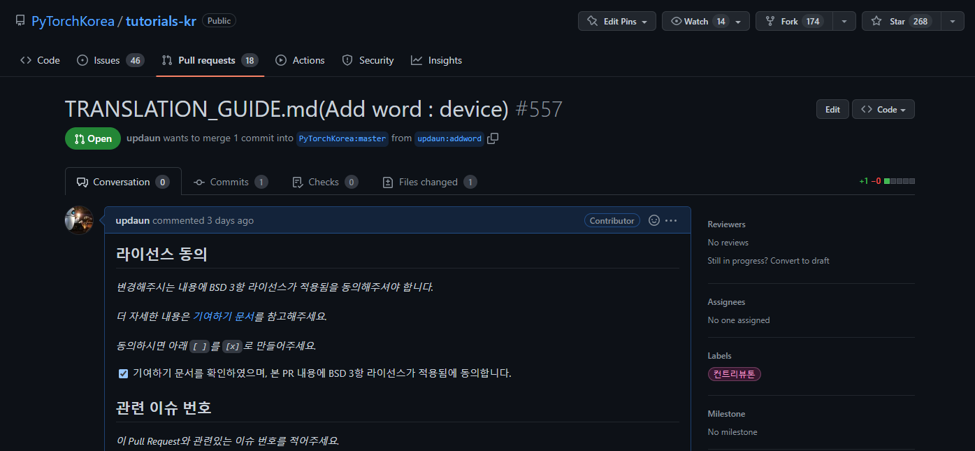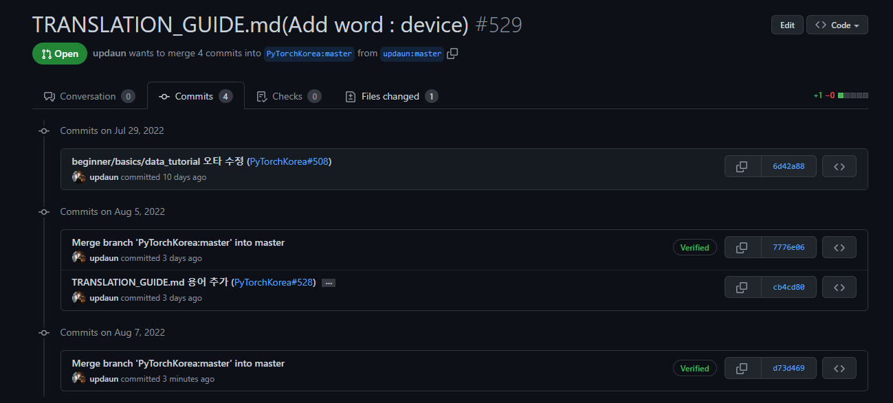 오픈소스 컨트리뷰톤이 시작된 지 얼마 안 되었을 때, 연습용 repo에 번역 연습으로 몇 줄만 번역해보고 PR을 하라 하셨는데, 그 때 의욕이 앞서서 미리 한 페이지를 번역하고, 조원들 4명에게 리뷰를 받고, 멘토님께도 리뷰를 한 번 받아서 지금까지 4차례 정도 추가 수정을 하게 된 것 같다!