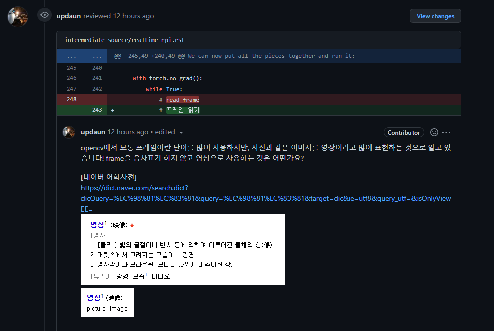 이번 주에는 우리 조 다른 인원의 번역 PR에 Peer Review를 남겨봤다. 주로 영어 표현을 그대로 사용한 경우 위주로 리뷰를 남겨보고 있다. 리뷰는 또한 근거를 제시하는 것이 좋을 것 같아 네이버 사전 및 자체 용어집을 근거로 리뷰를 작성했다.