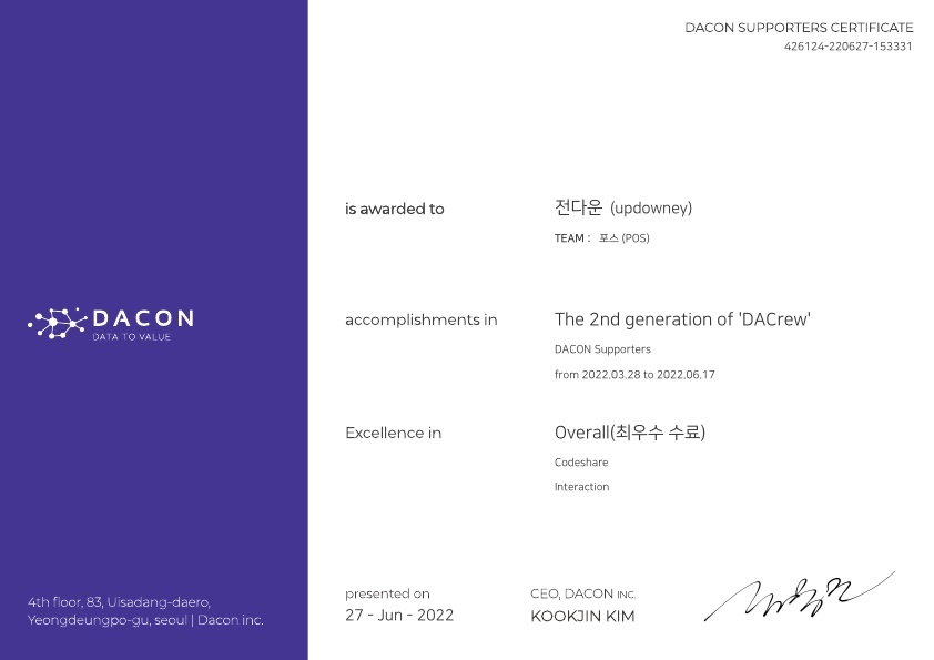 | [Dacon] 데이크루 2기 10주차 활동 일지 (1) | 2022.06.11 |