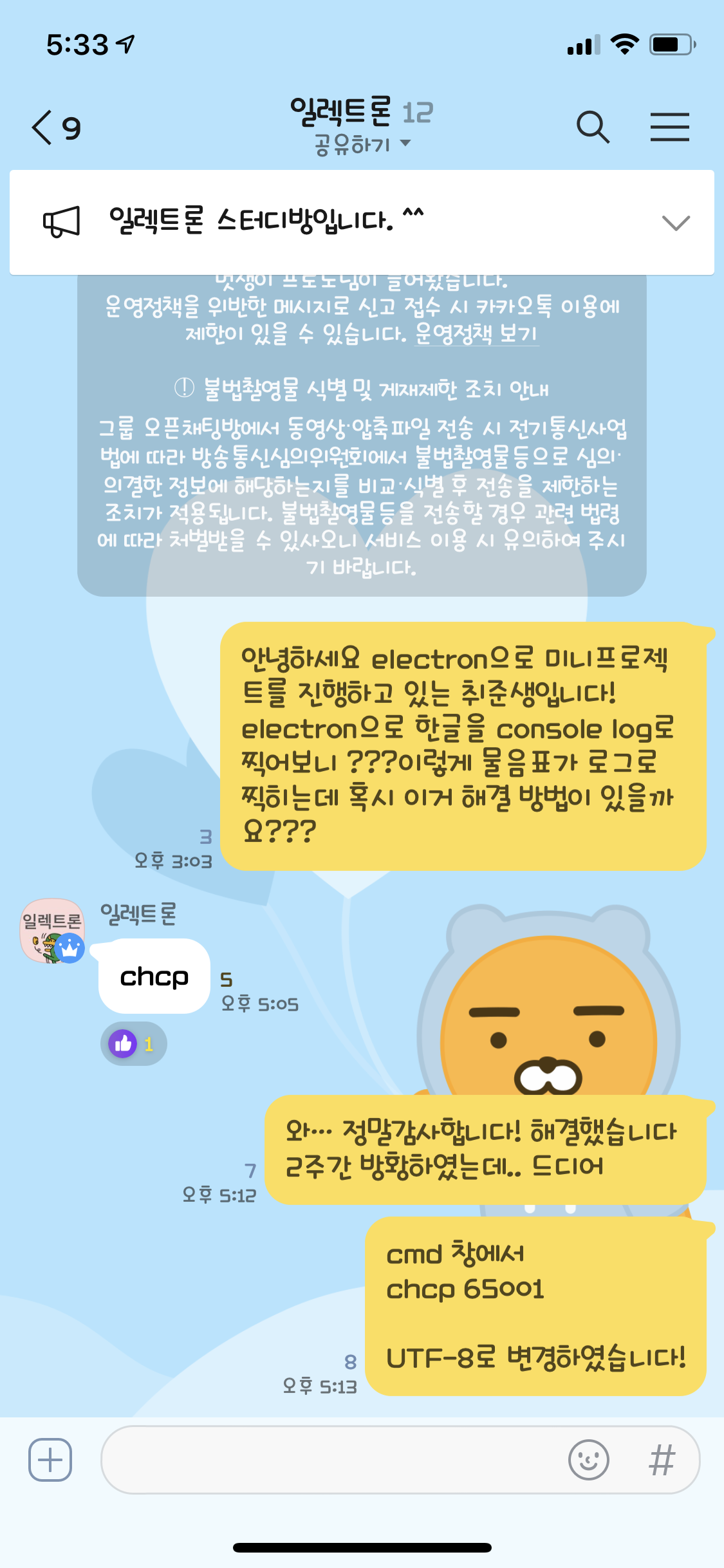카카오톡 오픈채팅방에서 electron 개발 하시는 분들 단톡방에 들어가서 해결 방법을 알게 되었다.