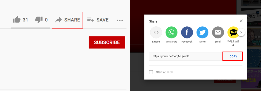 유튜브에서 소장하고 싶은 동영상에서 "SHARE" 버튼을 누르면 공유 링크가 보이는데 "COPY" 를 눌러서 경로를 복사한다.